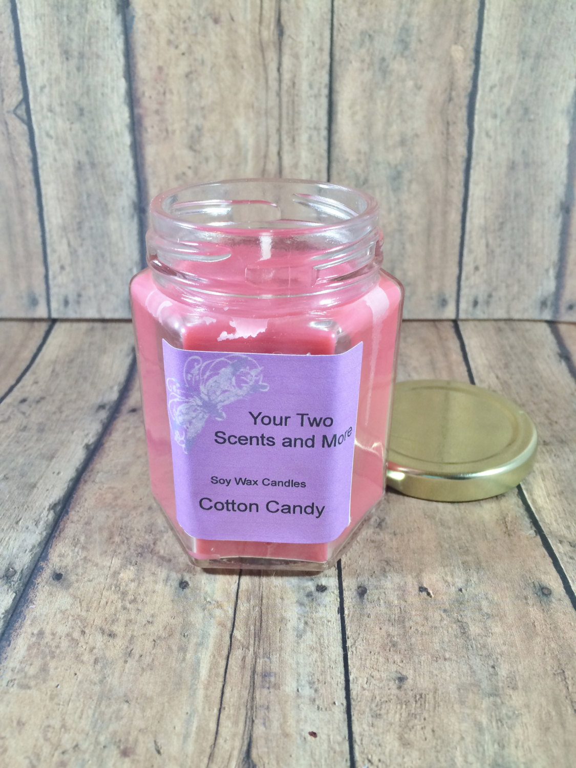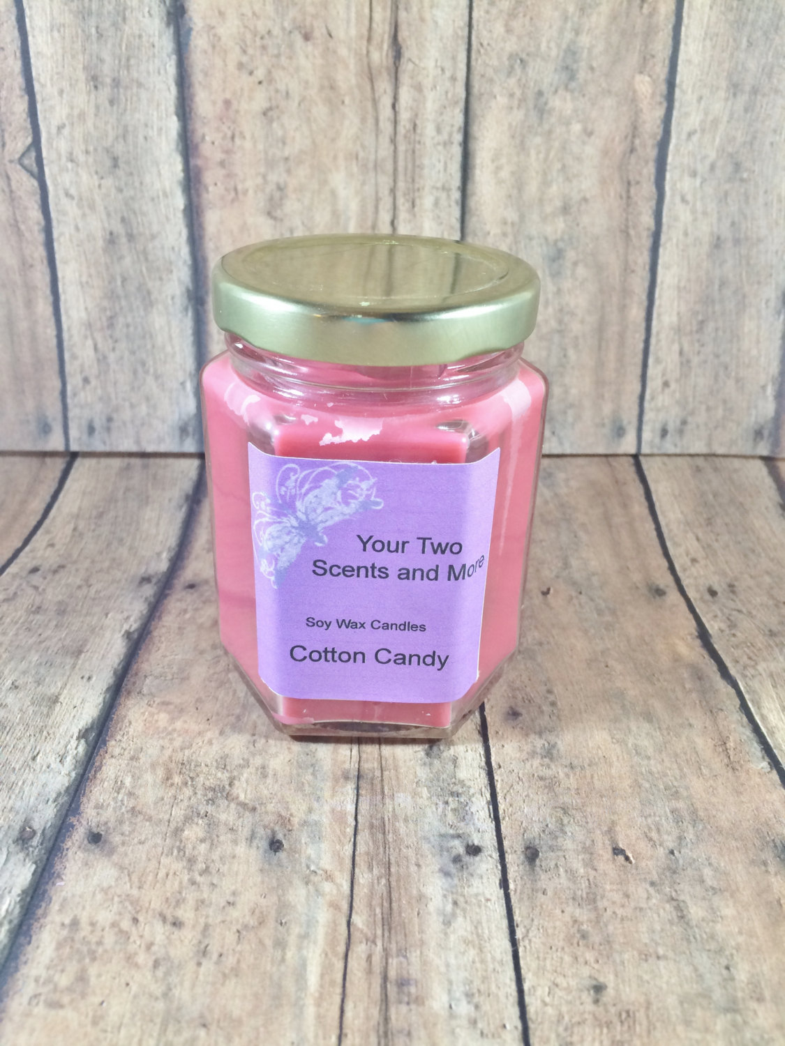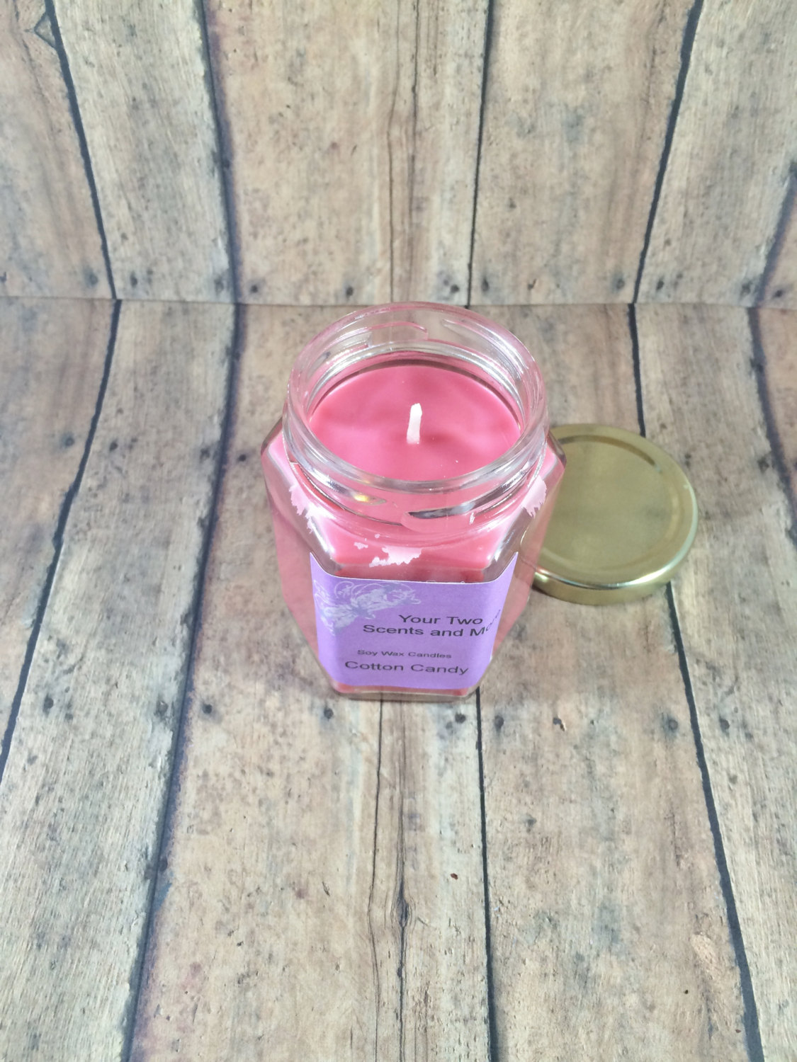The purchase of this listing is for one homemade Cotton Candy candle in a six-ounce hexagon jar with an approximate burn time of 42-49 hours.