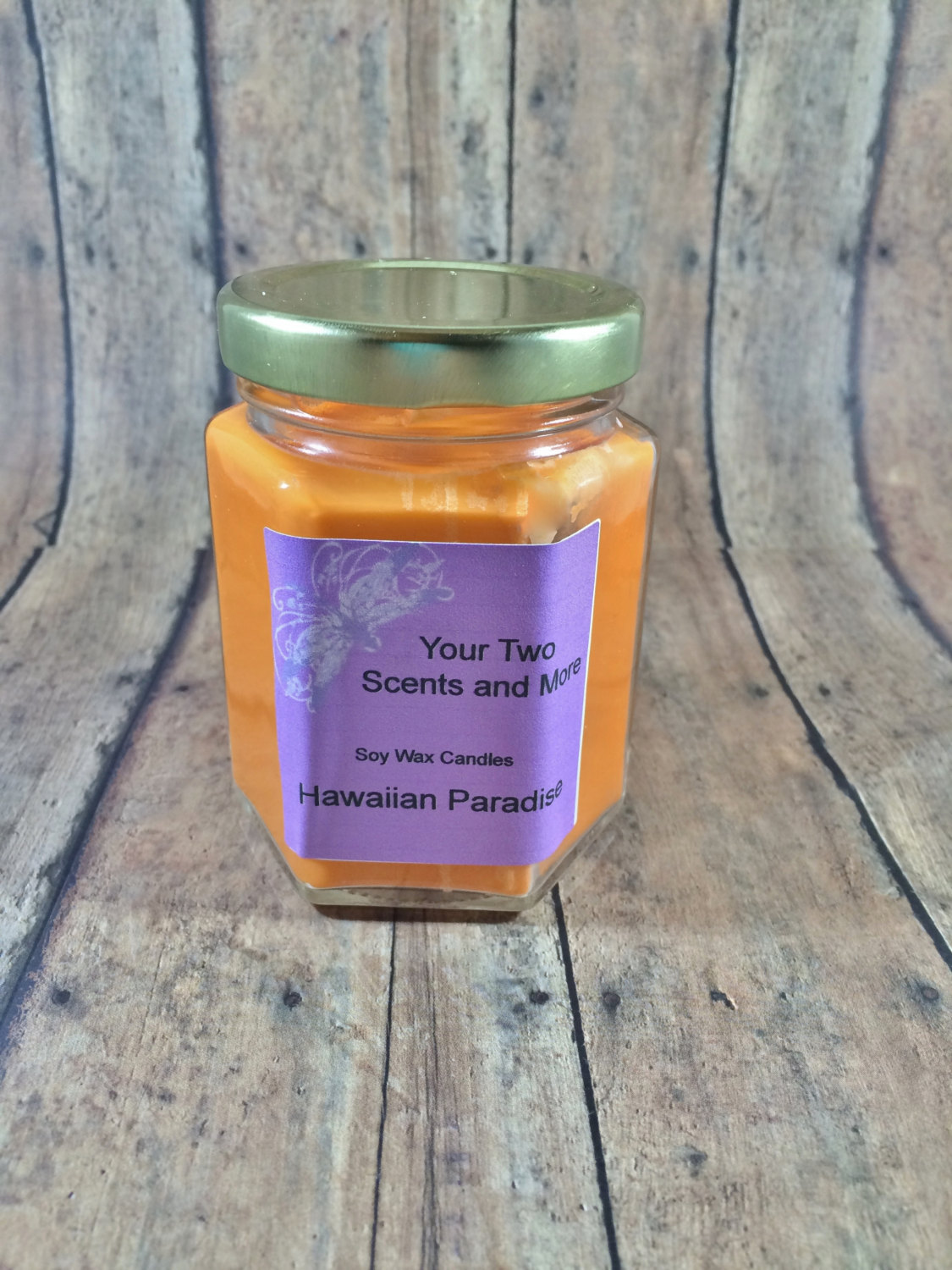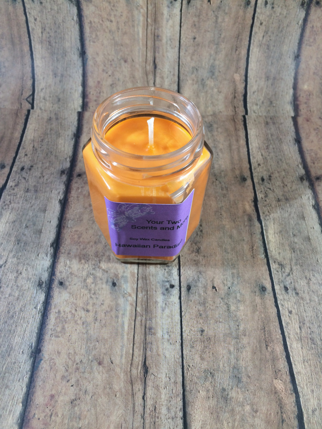 The purchase of this listing is for one homemade Hawaiian Paradise candle in a six-ounce hexagon jar with an approximate burn time of 42-49 hours.